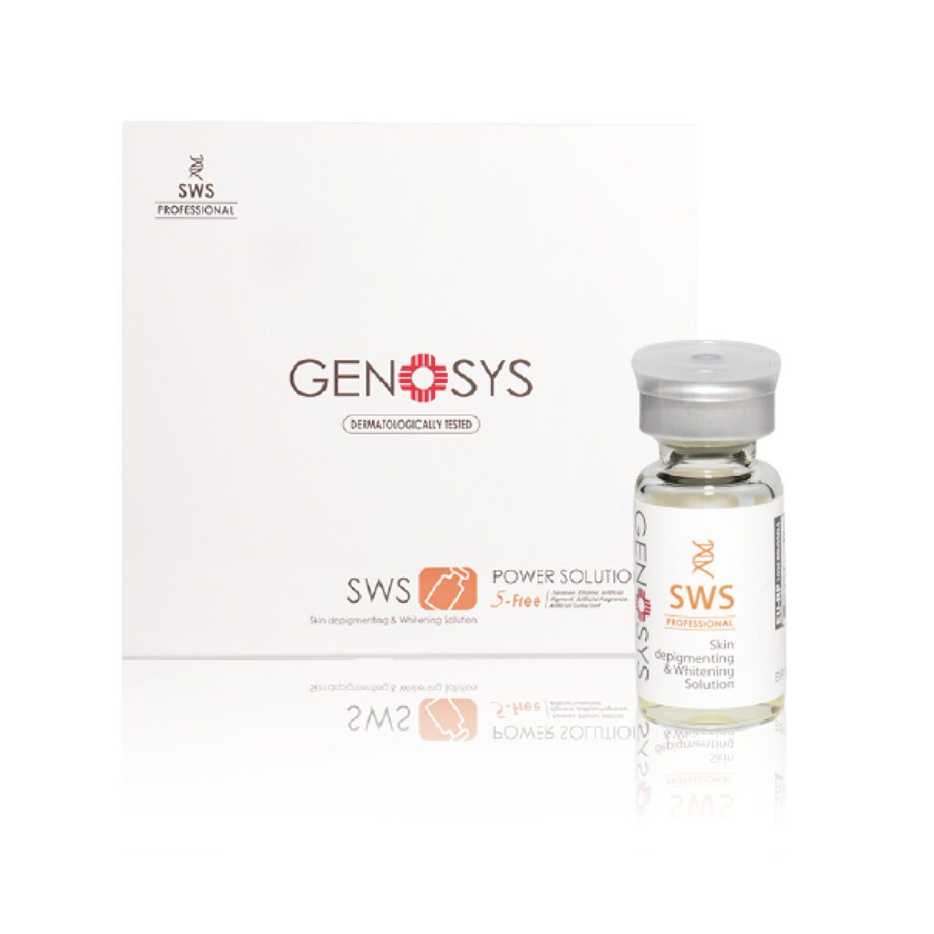 The GENOSYS Power Solution Skin Whitening SWS is a serum designed to improve skin pigmentation, even out skin tone, and brighten the skin’s surface. It is often used in professional treatments.